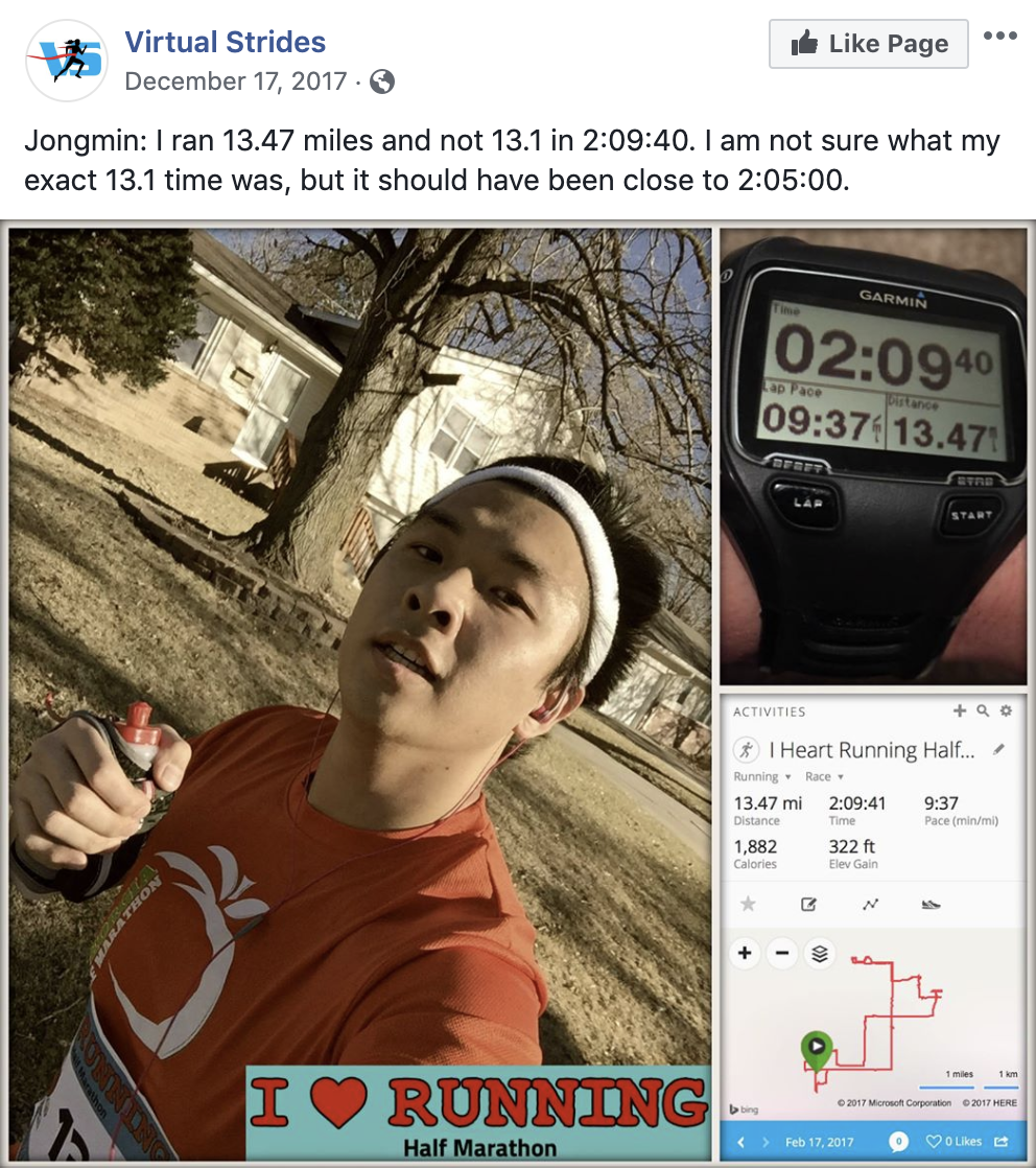 Presenting a webinar session internationally early in the morning, thanks to the time difference, I arrived at work at 5:50 AM and left around 3:00 PM on February 17, 2017. With a spring climate in forecast and ease of a virtual race, I, again, spontaneously decided to run a half marathon prior to my three-week business trip to Korea starting next Thursday. This time, I registered for Virtual Strides’ I Heart Running Half Marathon, partly because some of the registration fee is donated to the American Heart Association. Unlike for the Pizza Run 13.1M, I received an electronic bib upon signing up for the I Heart Running Half Marathon and thus color-printed and wore the number for the run, which likely confused many drivers and pedestrians I passed.