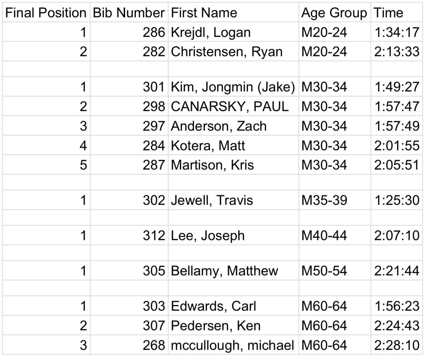 I secured my second-fastest 13.1 miles in 1:49:27 and a negative split in the second half, sufficient to declare me first place in my age group of 30-34 out of five, third male out of thirteen, and fifth overall out of thirty-three finishers. I still may have gone overboard tackling a half marathon this quickly after an ultra. I thank Jesus, as always, for protecting me and allowing me this joyous stress-relieving morning.
