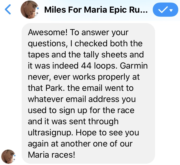 I had no way to track how many loops I completed. I could have tried, but doing so for such a short loop for eight hours felt verging on impossible; thus, I trusted whatever the organizers gave me. The official result reads I covered 44 loops, resulting in 35.2 miles. Once I returned home, I checked my Garmin and followed up with the race director if he could check again, because I thought I may have not quite reached that number based on the Garmin map. He confirmed, by looking again at the tally sheets and tapes, that I did indeed complete 44 loops, reminding me Garmin does not work well on this course. I decided it wiser to trust the word and judgment of the race director over this machine, especially since I already brought up my observation and did my part in being honest, and accept this result. Regardless, my objective of comfortably surpassing the 50K mark was fulfilled, making this my seventh ultramarathon, not to mention finishing third male overall. I am content. Thank You, Jesus!
